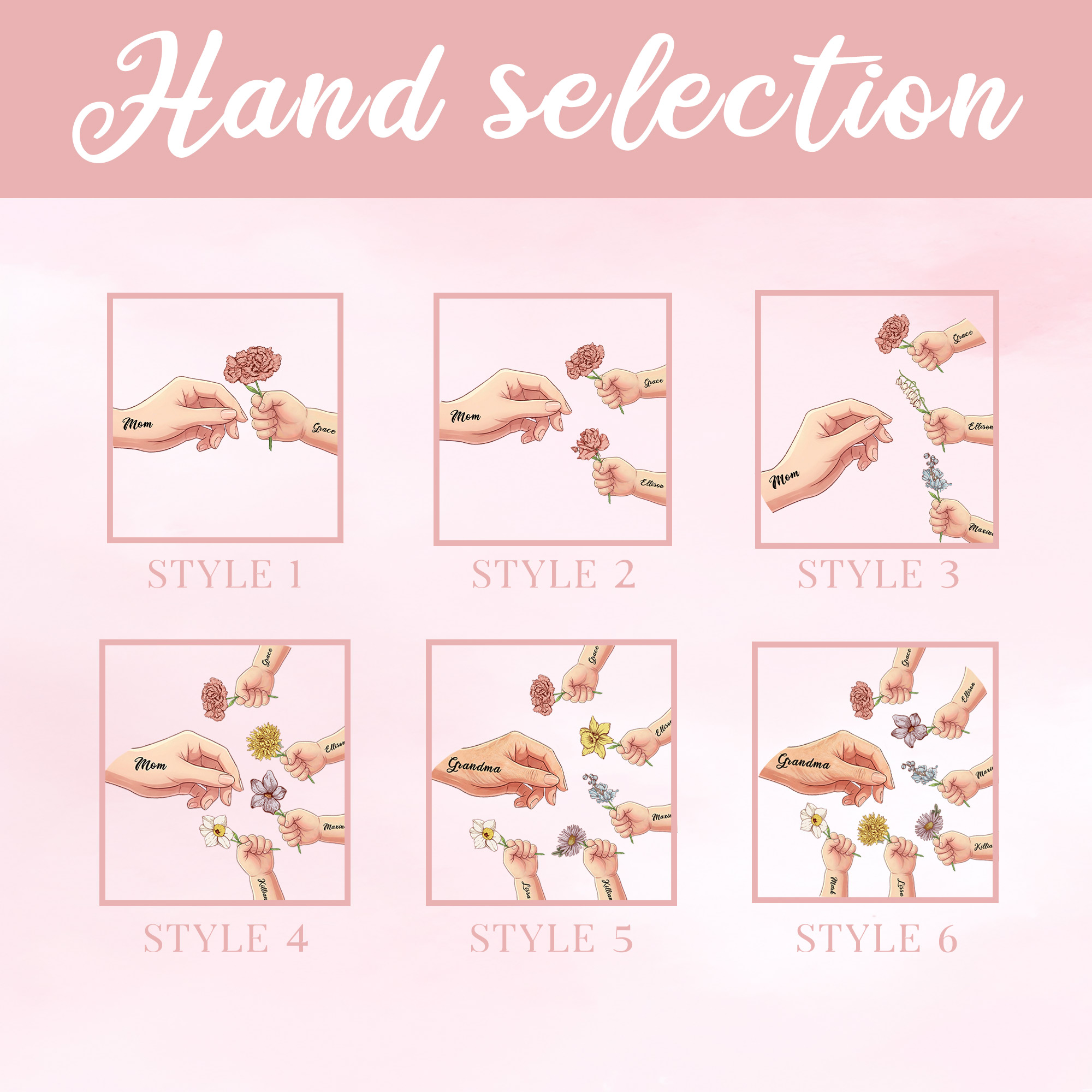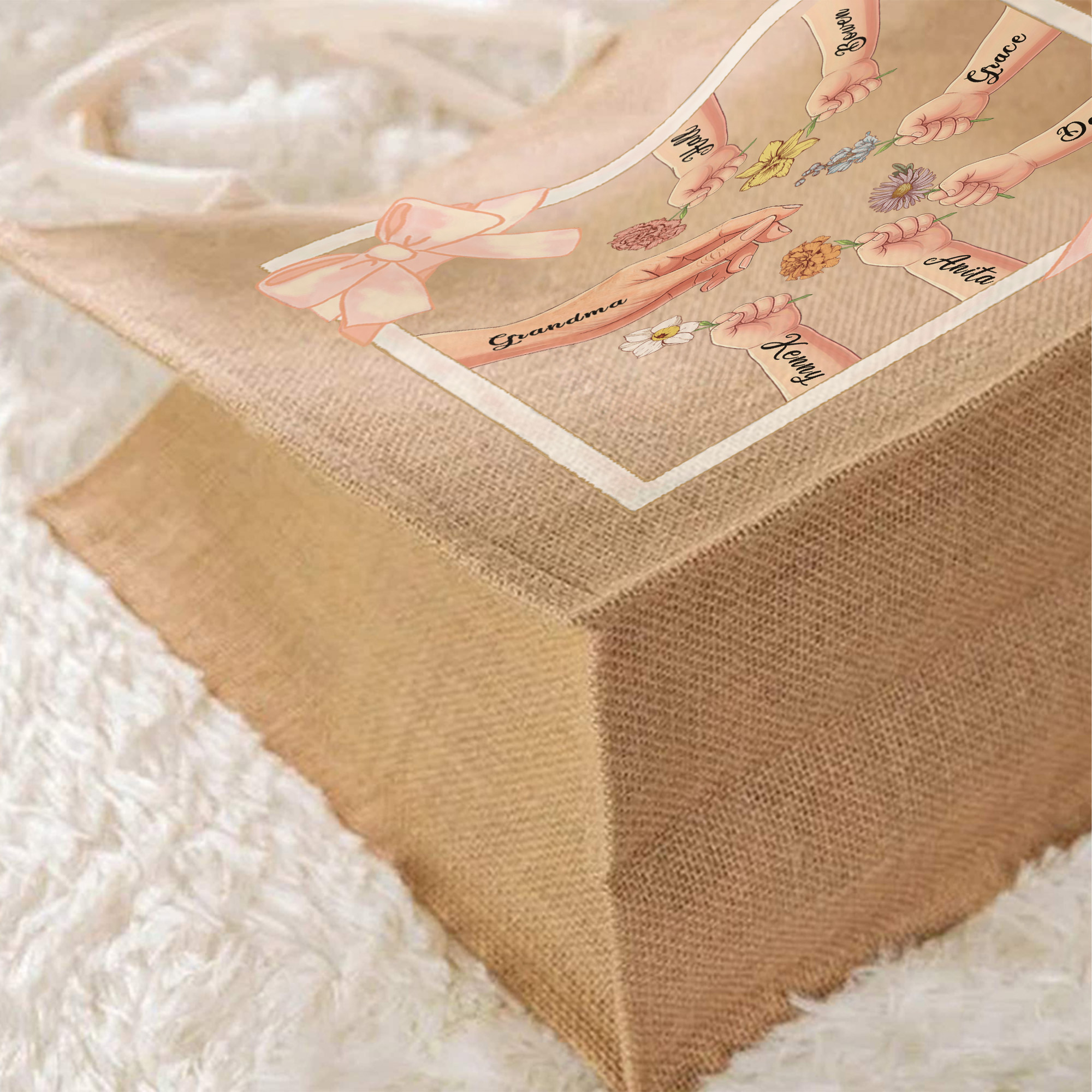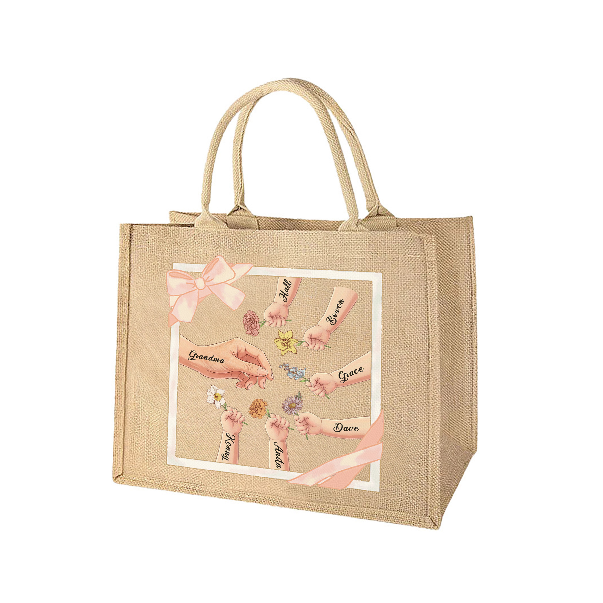 Heartwarming Family Design - This tote bag features a sweet illustration of a mom or grandma with children’s hands, paired with delicate birth flowers, names and a bow frame. The charming layout celebrates the special bond between a mother or grandmother and her kids or grandkids, giving the bag a warm and meaningful look.